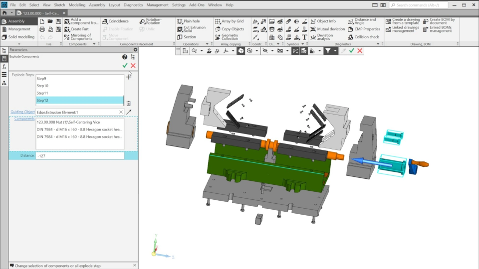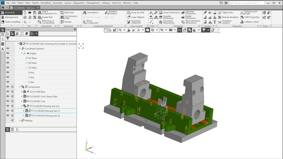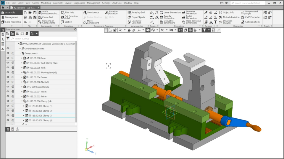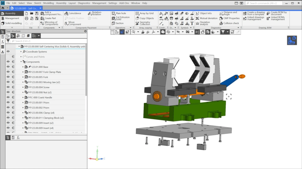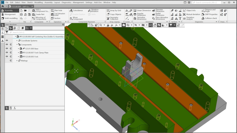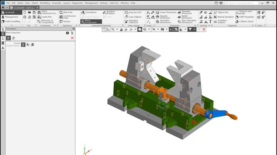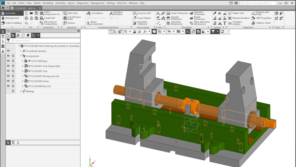 In this course, we’ll create an assembly – the self-centering vice. It will consist of more than sixty components, including two subassemblies. We’ll define component positions using different matings. Also, we’ll add a mechanical mating that will allow us to simulate the vice’s operation.Then, we’ll create an exploded view and learn how to edit it. We’ll generate a drawing, add a bill of materials, and create balloons.