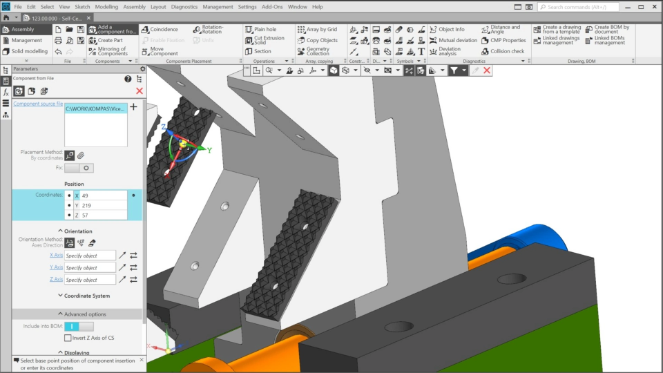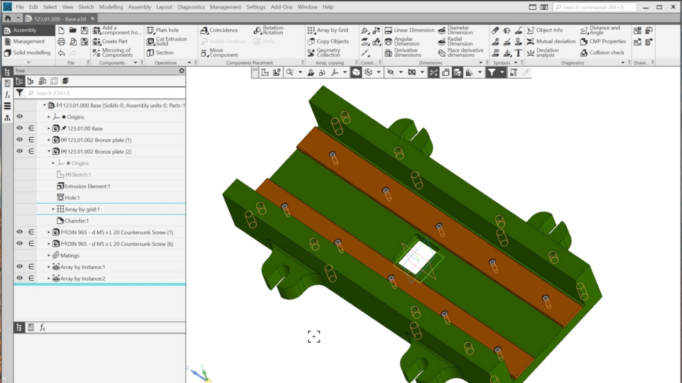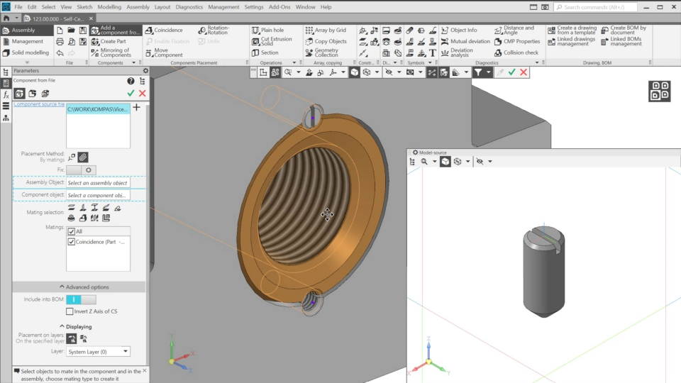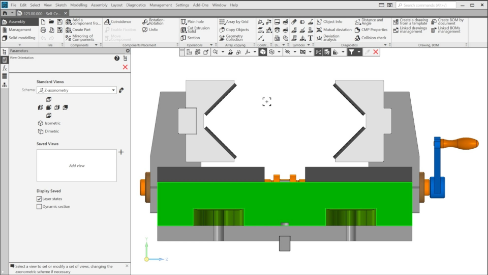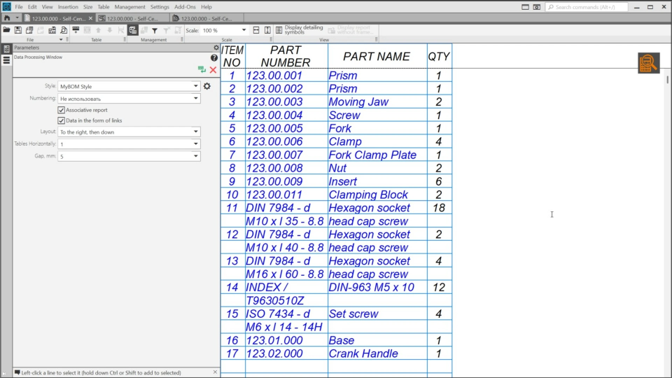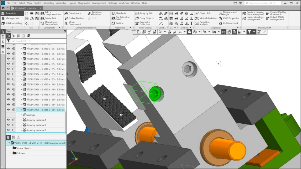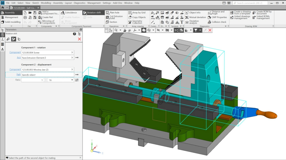 In this course, we’ll create an assembly – the self-centering vice. It will consist of more than sixty components, including two subassemblies. We’ll define component positions using different matings. Also, we’ll add a mechanical mating that will allow us to simulate the vice’s operation.Then, we’ll create an exploded view and learn how to edit it. We’ll generate a drawing, add a bill of materials, and create balloons.