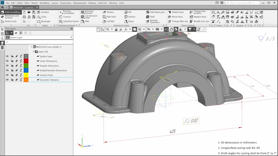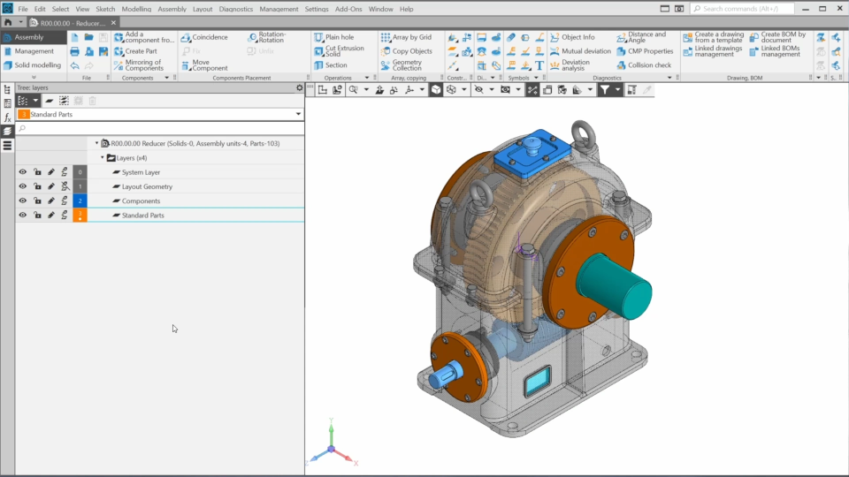 We’ll learn new functionality and also use standard Kompas features. We’ll explore layers in both part and assembly documents.Then, we’ll add standard parts using an application on the POLYNOM:MDM platform.